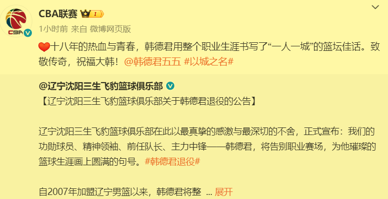 韩德君作为在CBA联赛征战18个赛季,帮助辽篮获得四个CBA总冠军和两块全运会金牌的主力中锋,在其退役之时,CBA官方也是十分罕见地向他送上了祝福!足以证明大韩在CBA联赛的影响力。